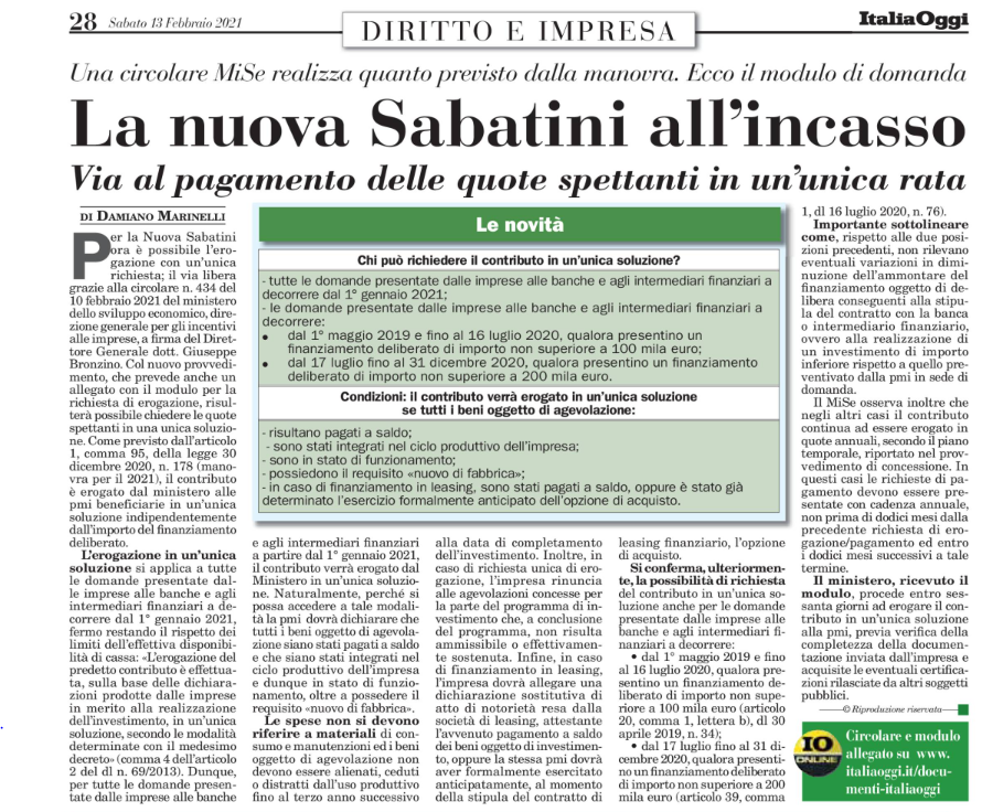 -> la nuova Sabatini (con erogazione quote spettanti in unica soluzione) è valida per tutte le domande presentate dal 1° gennaio 2021 (sempre nei limiti della disponibilità fondi)